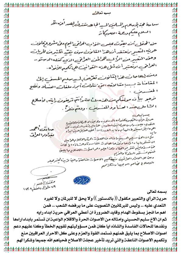 تصويت البرلمان على قانون حرية الرأي وتعرض سليم الحسني الى المقاضاة استفتاء الزعيم العراقي السيد القائد مقتدى الصدر اعزه الله 24 / 7 /2017