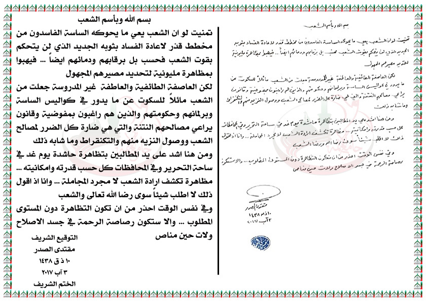 اشد على يد المطالبين بتظاهرة حاشدة يوم غد في ساحة التحرير وفي المحافظات كل حسب قدرته وامكانيته بيان الزعيم العراقي القائد السيد مقتدى الصدر اعزه الله 3~8~2017