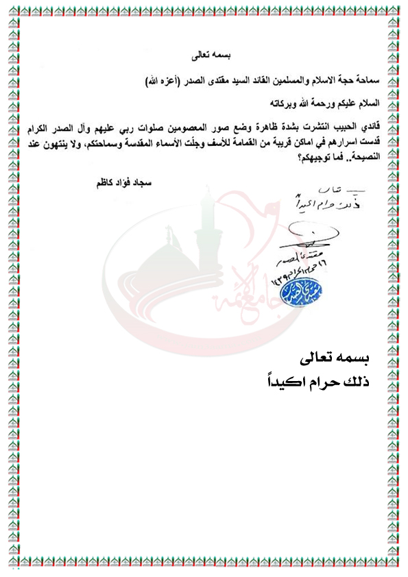 قيام البعض بوضع صور المعصومين (عليهم السلام) وشهداء آل الصدر الكرام قريبة من أماكن تجمع فيها القمامة استفتاء القائد السيد مقتدى الصدر اعزه الله 7~10~2017