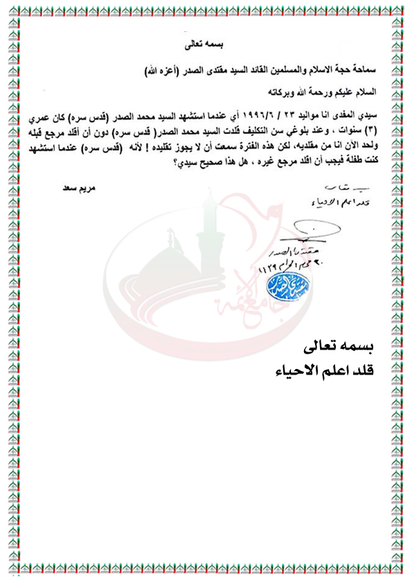 سؤال حول التقليد استفتاء القائد السيد مقتدى الصدر اعزه الله 11 / 10 / 2017