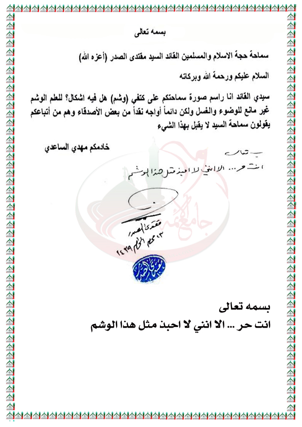 وشم احدهم لصورة سماحته على جسمه استفتاء القائد السيد مقتدى الصدر اعزه الله 14~10~2017