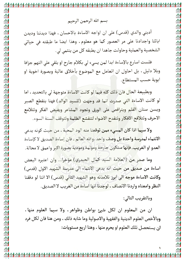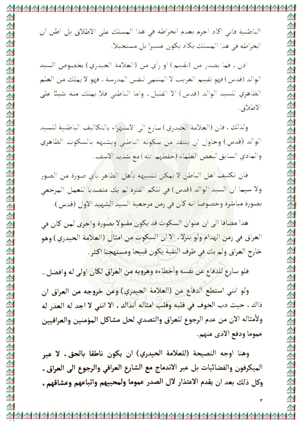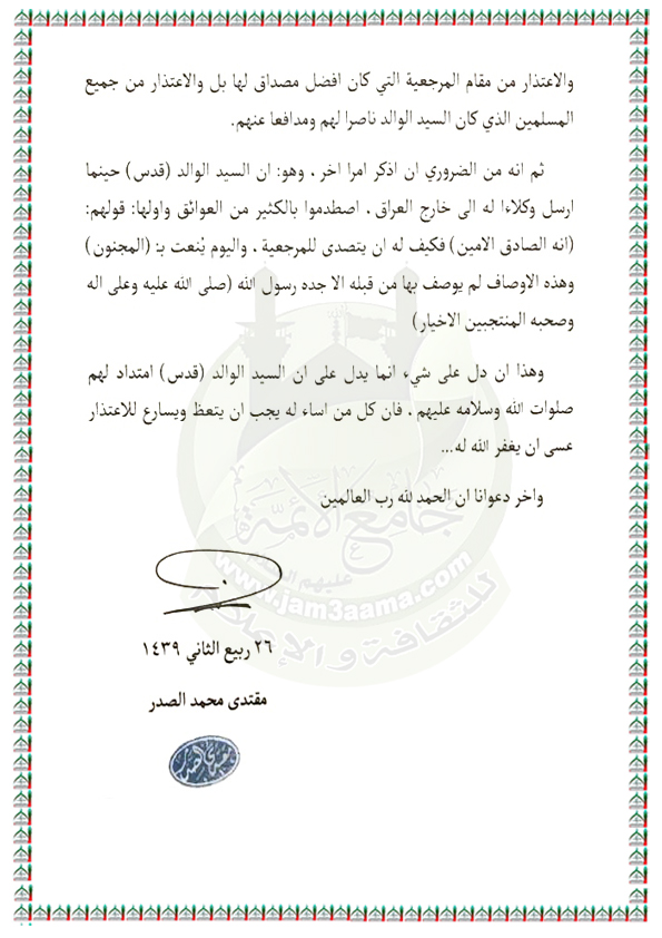 بخصوص ما تداول مؤخراً في مقطع صوتي للسيد كمال الحيدري فيه اساءة للشهيد السعيد السيد محمد الصدر (قدس) بيان السيد القائد مقتدى الصدر اعزه الله 14 / 1 / 2018