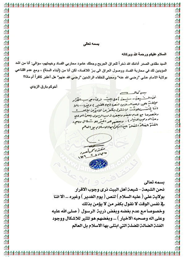 من لا يؤمن بولاية الامام علي عليه السلام هل يعتبر كافراً ؟ استفتاء الزعيم العراقي السيد مقتدى الصدر اعزه الله 4 / 3 / 2018