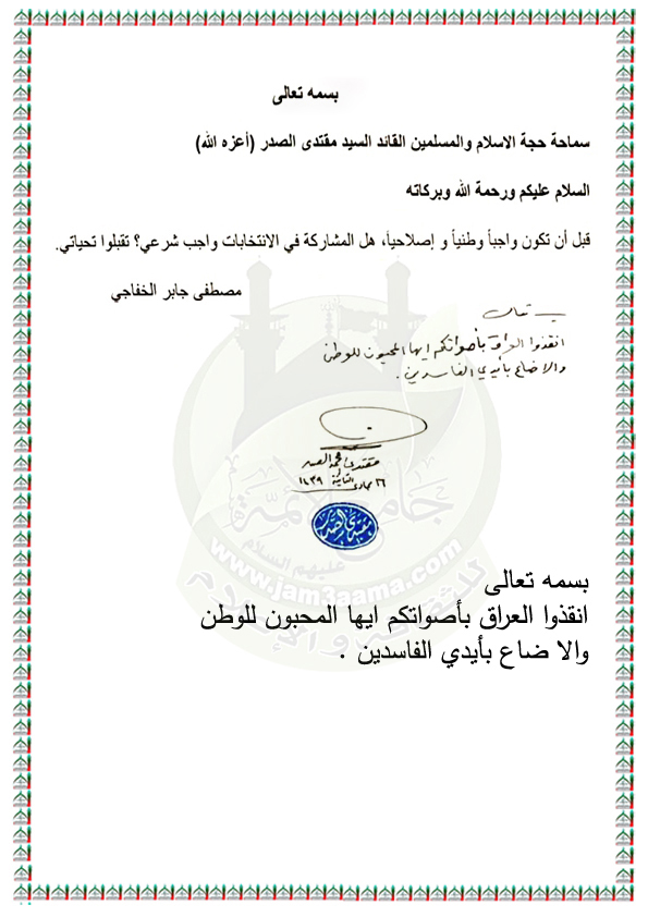 انقذوا العراق بأصواتكم ايها المحبون للوطن والا ضاع بأيدي الفاسدين استفتاء الزعيم العراقي السيد مقتدى الصدر اعزه الله 5 / 3 / 2018