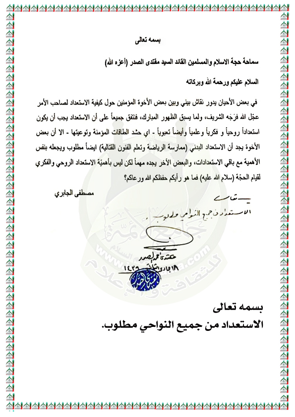 الأمور المطلوب توفرها استعداداً للظهور المبارك لصاحب العصر والزمان (عجّلَ الله فرَجَه الشريف) استفتاء القائد السيد مقتدى الصدر اعزه الله 7 / 3 / 2018