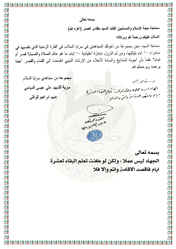 حكم الصلاة والصوم للمجاهدين استفتاء الزعيم العراقي السيد مقتدى الصدر اعزه الله 22 / 3 / 2018
