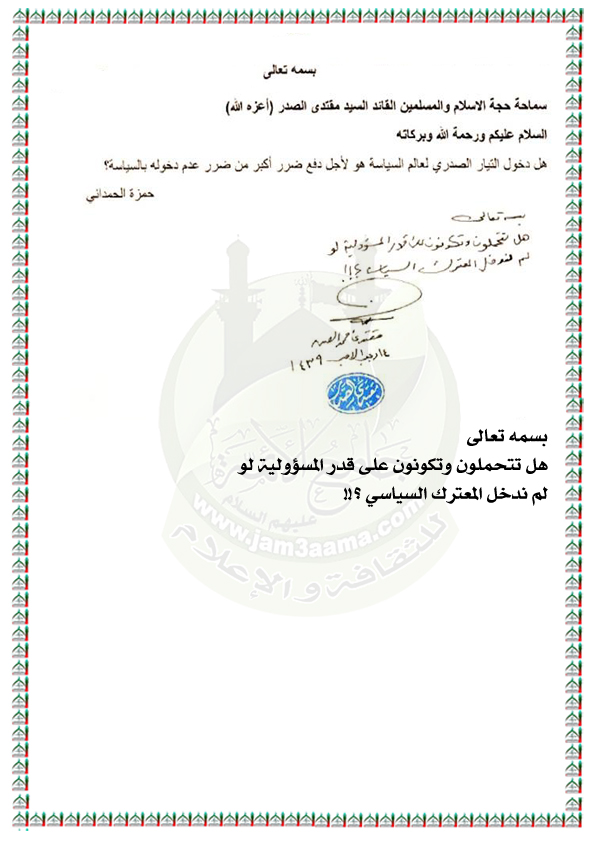 ما إذا كان دخول التيار الصدري للمعترك السياسي هو لدفع ضرر أكبر من ضرر عدم دخوله استفتاء الزعيم العراقي السيد مقتدى الصدر اعزه الله 1 / 4 / 2018