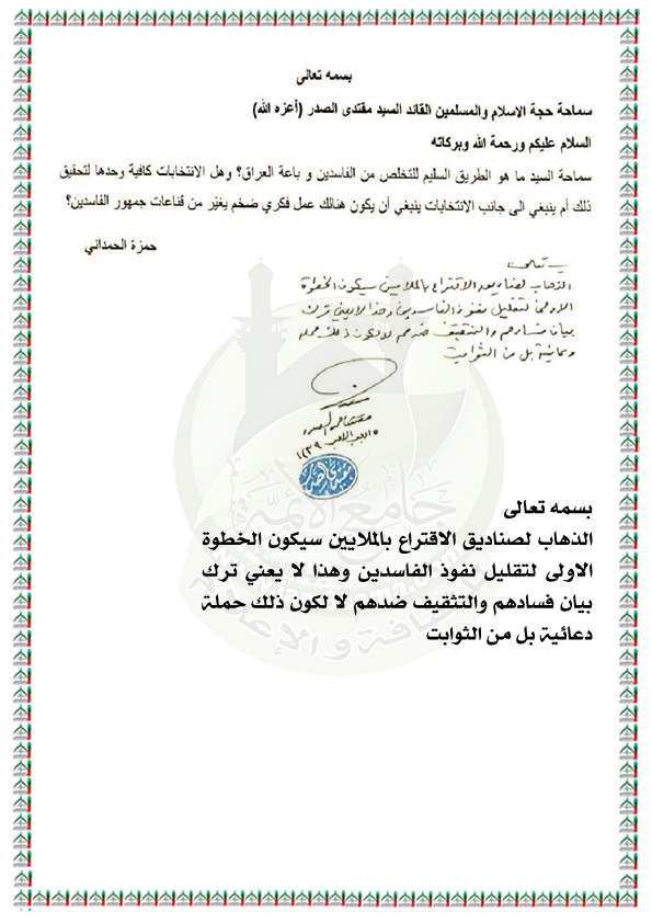 الذهاب الى صناديق الاقتراع بالملايين الخطوة الأولى لتقليل نفوذ الفاسدين وهذا لا يعني ترك بيان فسادهم والتثقيف ضدهم استفتاء الزعيم العراقي السيد مقتدى الصدر اعزه الله 2 / 4 / 2018