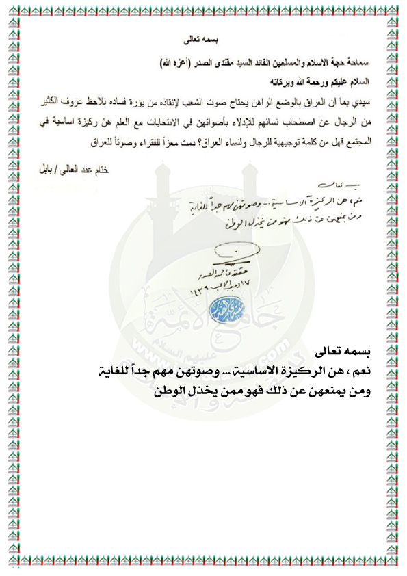 عزوف بعض الرجال من اصطحاب نسائهم للإدلاء بأصواتهن في الانتخابات استفتاء الزعيم العراقي السيد مقتدى الصدر اعزه الله 4 / 4 / 2018