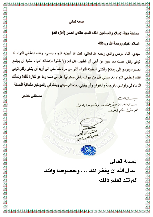 قيام أحد الأشخاص بإعطاء الدواء لوالده المريض دون علمه بأنه سيؤدي الى وفاته استفتاء الزعيم العراقي السيد مقتدى محمد الصدر اعزه الله 7 / 4 / 2018