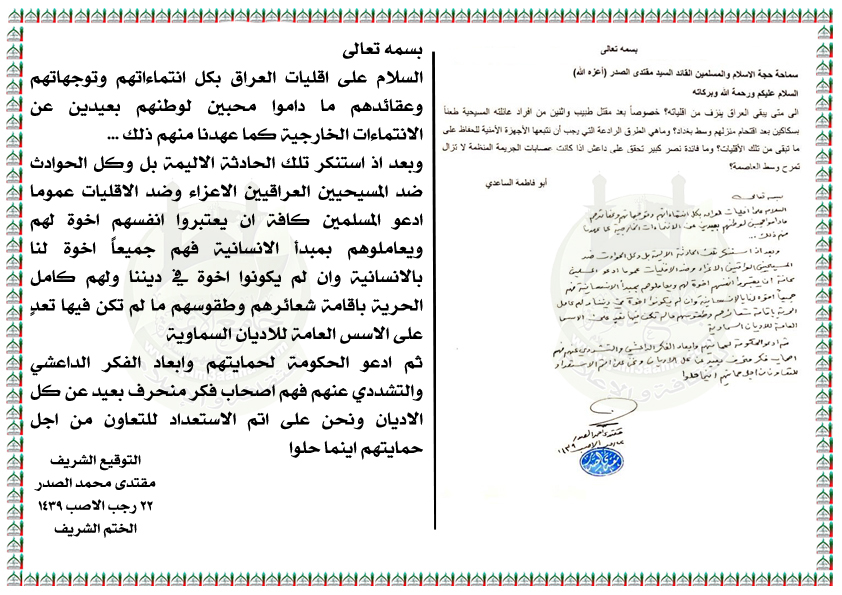 الاستعداد للتعاون من أجل حماية المسيحيين وباقي الأقليات استفتاء الزعيم العراقي السيد مقتدى محمد الصدر اعزه الله 9 / 4 / 2018