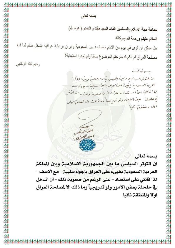 الاستعداد للتدخل لحلحلة الامور بين الجمهورية الاسلامية الايرانية والمملكة السعودية استفتاء الزعيم العراقي السيد مقتدى محمد الصدر اعزه الله 10 / 4 / 2018