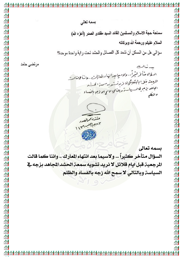 التأكيد على ما قالته المرجعية بأهمية الحفاظ سمعة الحشد المجاهد بعدم زجّه في السياسة مما يؤدي الى زجّه بالفساد والظلم استفتاء الزعيم العراقي السيد مقتدى محمد الصدر اعزه الله 10 / 4 / 2018
