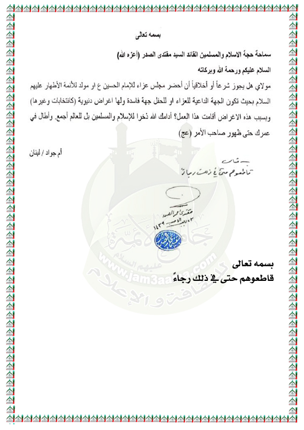 مقاطعة الجهات الفاسدة حتى في إقامتهم لمجالس العزاء والمواليد للأئمة الأطهار (عليهم السلام) التي تستغـل للدعايات الانتخابية استفتاء الزعيم العراقي السيد مقتدى محمد الصدر اعزه الله 10 / 4 / 2018