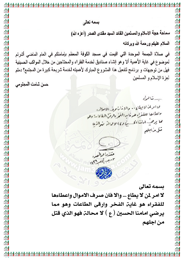 دعوة سماحته في وقت سابق لإنشاء صناديق دعم الفقراء في المواكب الحسينية استفتاء الزعيم العراقي السيد مقتدى محمد الصدر اعزه الله 10 / 4 / 2018