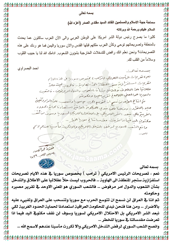 نبدي للحكومة العراقية استعدادنا لحماية الحدود الغربية لكي نبعد الشر الامريكي بل الاحتلال الامريكي لسوريا استفتاء الزعيم العراقي السيد مقتدى محمد الصدر اعزه الله 11 / 4 / 2018