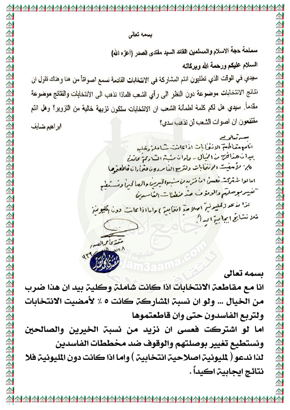 اعتقاد البعض بعدم جدوى المشاركة في الانتخابات ما دامت النتائج موضوعة مسبقاً استفتاء الزعيم العراقي السيد مقتدى الصدر اعزه الله 15 / 4 / 2018