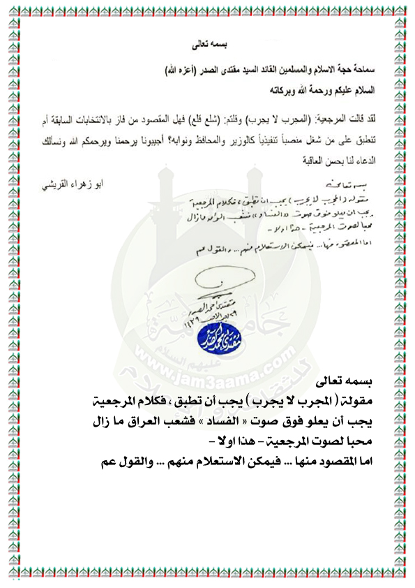 مقولة المجرب لا يجرب يجب أن تطبق فكلام المرجعية يجب أن يعلو فوق صوت الفساد فشعب العراق ما زال محباً لصوت المرجعية استفتاء الزعيم العراقي السيد مقتدى الصدر اعزه الله 16 / 4 / 2018