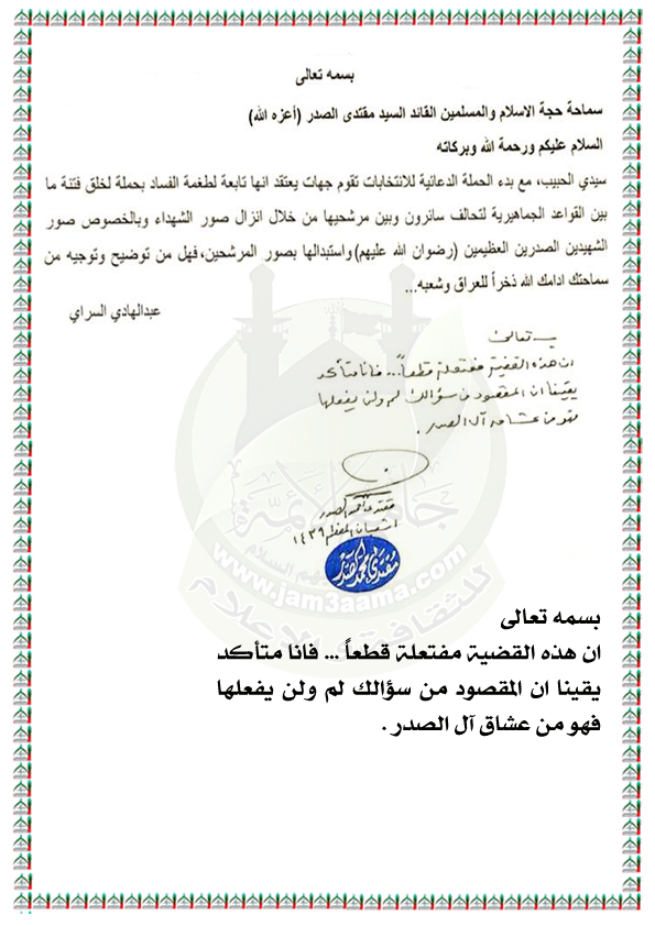 محاولات بعض الجهات لخلق فتنة بين مرشحي قائمة سائرون والجماهير المؤيدة لها من خلال إزالة صور الشهيدين الصدرين (قدس سريهما) ووضع صور مرشحي القائمة بدلاً عنها استفتاء الزعيم العراقي السيد مقتدى الصدر اعزه الله 18 / 4 / 2018 http://www.jam3aama.com/up/do.php?img=9316 |