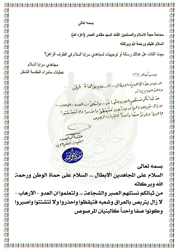 الإشادة بصبر وشجاعة مجاهدي سرايا السلام وتحذيرهم من تربص الإرهاب بالعراق وشعبه استفتاء الزعيم العراقي السيد مقتدى الصدر اعزه الله 19 / 4 / 2018