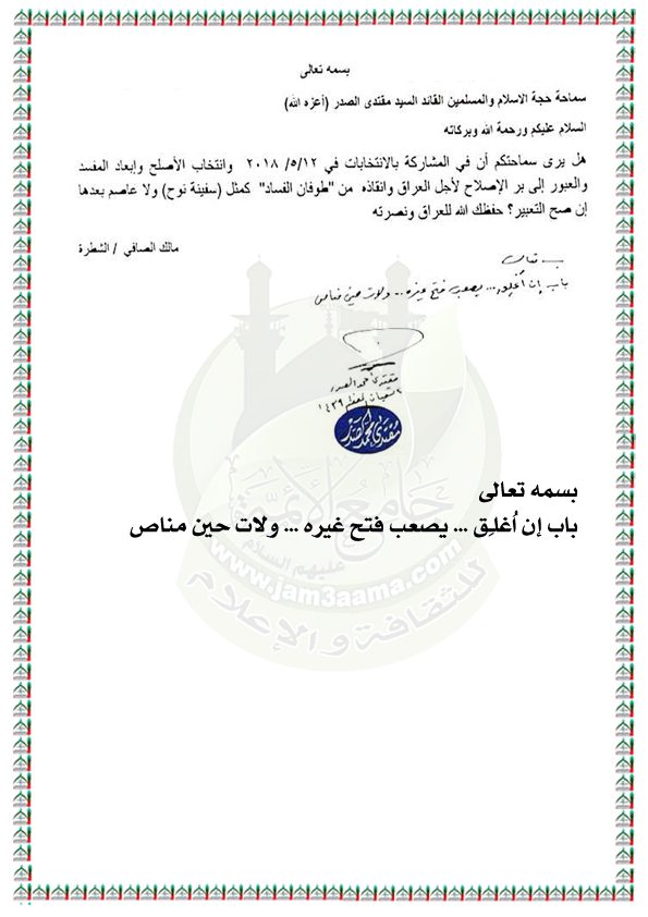 رؤية سماحته لمستقبل الاصلاح في العراق وما تمثله المشاركة في الانتخابات البرلمانية المقبلة استفتاء الزعيم العراقي السيد مقتدى الصدر اعزه الله 19 / 4 / 2018
