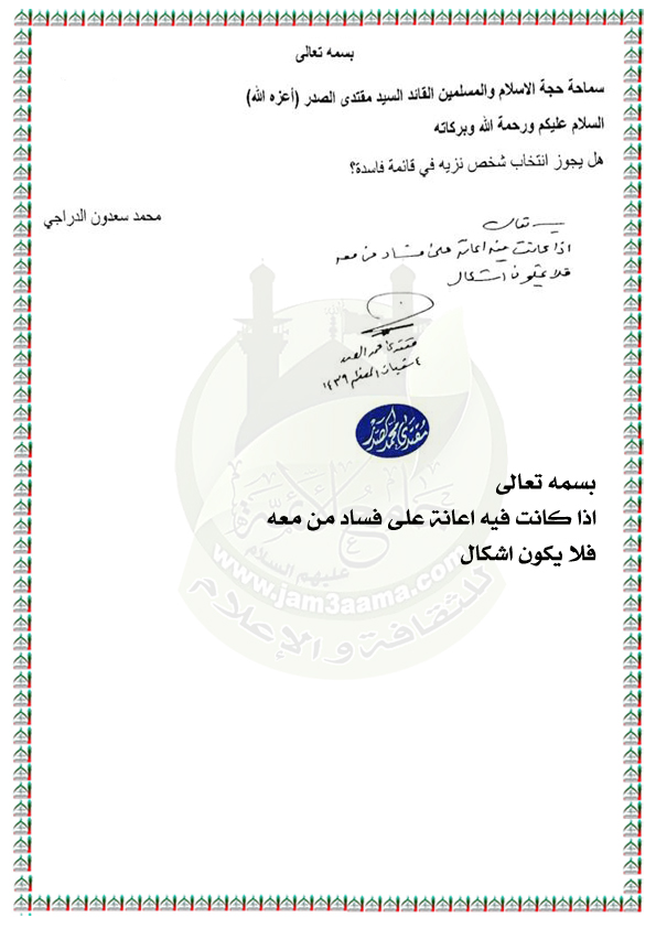 انتخاب مرشح نزيه في قائمة فاسدة استفتاء الزعيم العراقي السيد مقتدى الصدر اعزه الله 21 / 4 / 2018