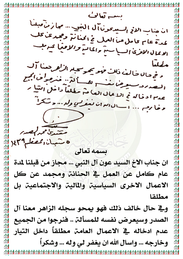 اجازة لمدة عام كامل للسيد عون آل النبي عن العمل في الحنانة وتجميده عن كل الاعمال الاخرى السياسية والمالية والاجتماعية بل مطلقا بيان الزعيم العراقي السيد مقتدى الصدر اعزه الله 21 / 4 / 2018