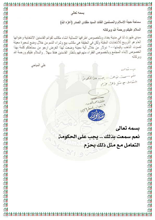 قيام بعض الجهات بفتح مكاتب يديرها الفاسدون ظاهرها الترويج للانتخابات وحقيقتها شراء الذمم من خلال استغلال الفقراء استفتاء الزعيم العراقي السيد مقتدى الصدر اعزه الله 23 / 4 / 2018