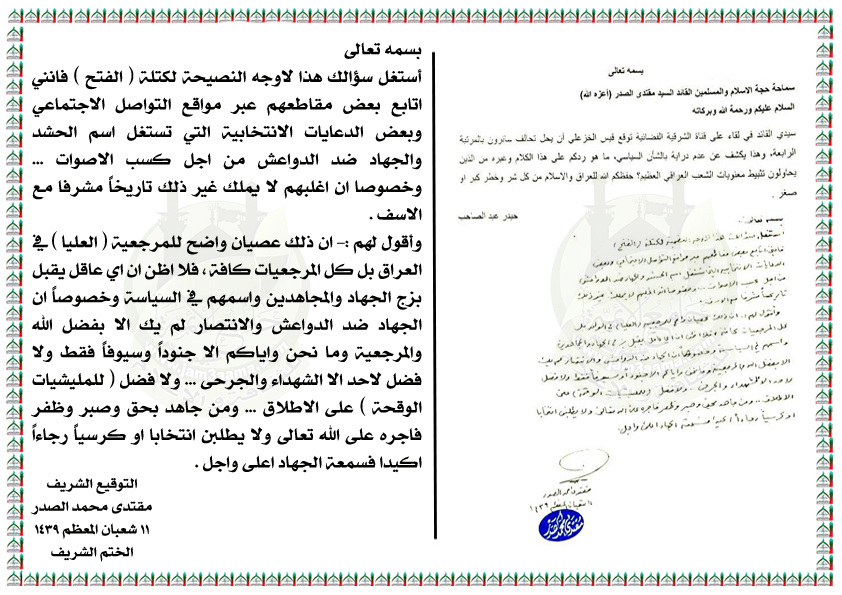 نصيحة الى كتلة الفتح استفتاء الزعيم العراقي السيد مقتدى محمد الصدر اعزه الله 28 / 4 / 2018