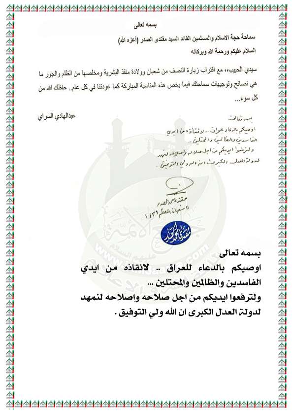 أوصيكم بالدعاء للعراق لإنقاذه من أيدي الفاسدين والظالمين والمحتلين ولترفعوا أيديكم من أجل صلاحه وإصلاحه لنمهّد لدولة العدل الكبرى استفتاء الزعيم العراقي السيد مقتدى محمد الصدر اعزه الله 30 / 4 / 2018