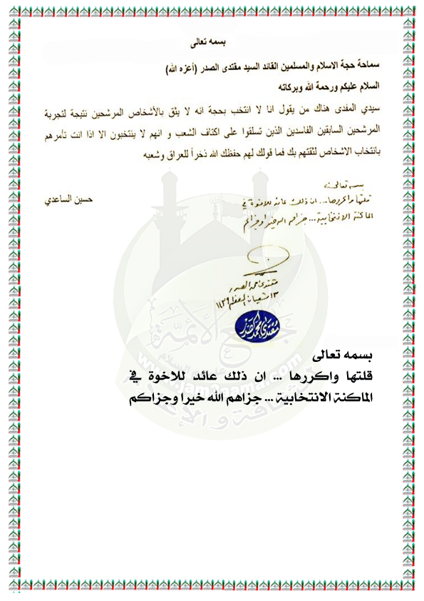 من يقول انه لا ينتخب لعدم ثقته بالمرشحين استفتاء الزعيم العراقي السيد مقتدى محمد الصدر اعزه الله 30 / 4 / 2018