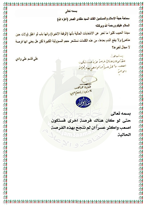 في حالة عدم نجاح المليونية الإصلاحية الانتخابية سيكون من العسير والصعوبة النجاح في أي فرصة اخرى استفتاء الزعيم العراقي السيد مقتدى محمد الصدر اعزه الله 1 / 5 / 2018