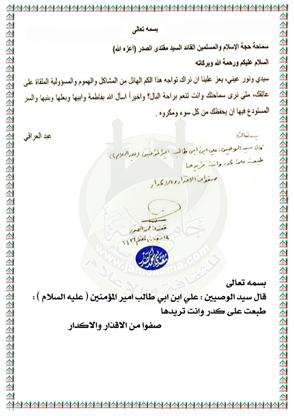 كيفية مواجهة سماحته للكم الهائل من المشاكل والهموم والمسؤولية الملقاة على عاتق سماحته استفتاء الزعيم العراقي السيد مقتدى محمد الصدر اعزه الله 1 / 5 / 2018