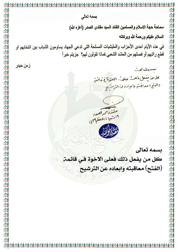 مساومة احدى الاحزاب والفصائل المسلحة لانتخاب مرشحيها أو فصلهم من الحشد الشعبي وقطع رواتبهم استفتاء الزعيم العراقي السيد مقتدى محمد الصدر اعزه الله 3 / 5 / 2018