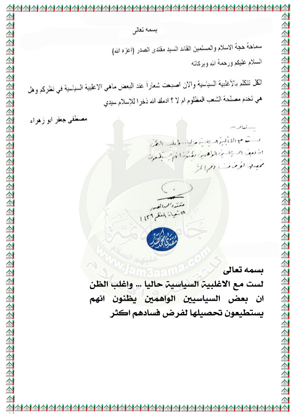 الموقف من الأغلبية السياسية استفتاء الزعيم العراقي السيد مقتدى محمد الصدر اعزه الله 5 / 5 / 2018