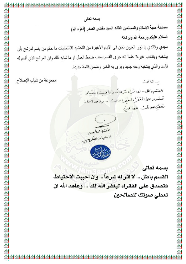 القسم بانتخاب المرشح الفاسد باطل ولا أثر له شرعاً استفتاء الزعيم العراقي السيد مقتدى محمد الصدر اعزه الله 5 / 5 / 2018