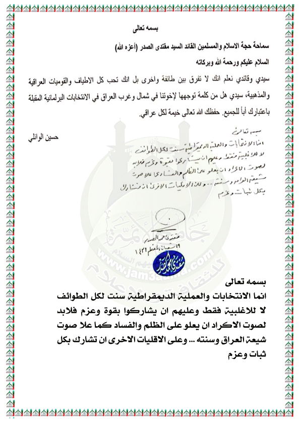 حث جميع مكونات الشعب العراقي وأقلياته على المشاركة بقوة وعزم في الانتخابات وأن يعلو صوتهم على الظلم والفساد استفتاء الزعيم العراقي السيد مقتدى محمد الصدر اعزه الله 6 / 5 / 2018