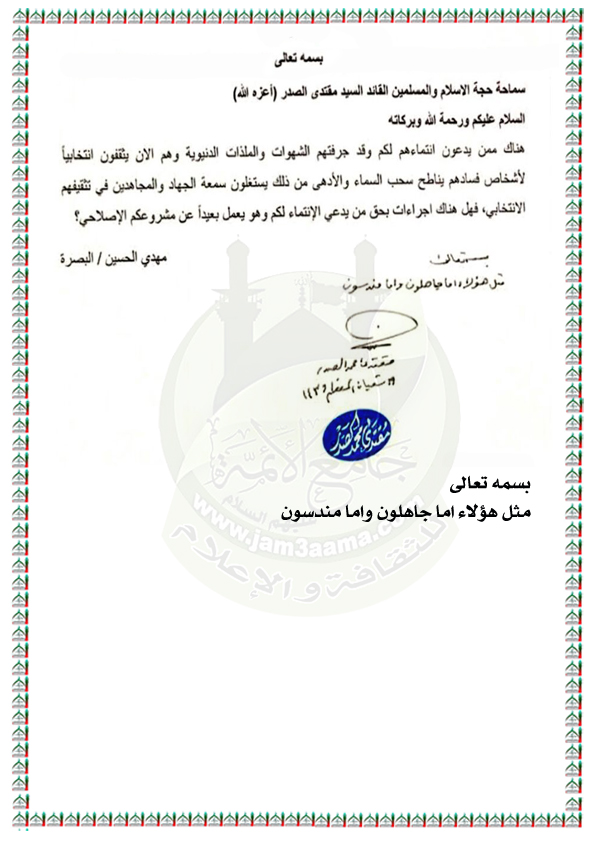 من يدّعون الانتماء للتيار الصدري وهم يثقفون لمرشحين فاسدين استفتاء الزعيم العراقي السيد مقتدى محمد الصدر اعزه الله 6 / 5 / 2018