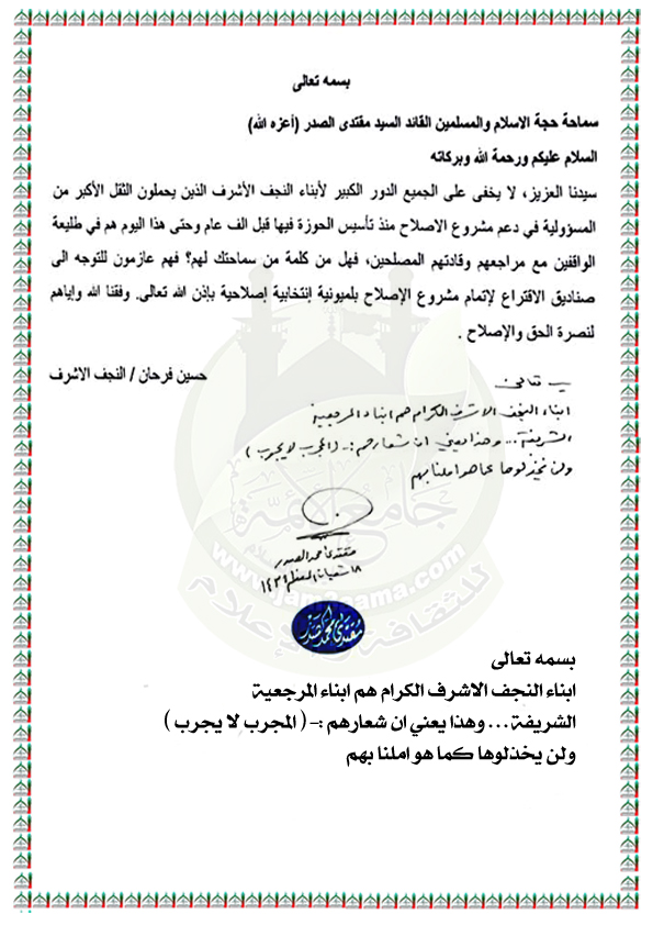 دور أبناء محافظة النجف الأشرف وعزمهم لدعم مشروع الإصلاح في الانتخابات استفتاء الزعيم العراقي السيد مقتدى محمد الصدر اعزه الله 5 / 5 / 2018