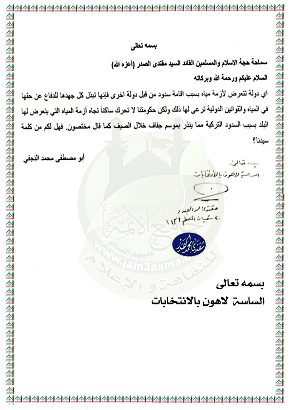 عدم التحرك الجدي من قبل الحكومة تجاه إقامة تركيا للسدود على الانهر المشتركة استفتاء الزعيم العراقي السيد مقتدى محمد الصدر اعزه الله 7 / 5 / 2018