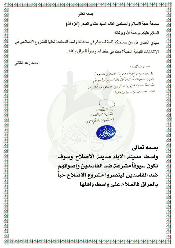 واسط مدينة الاباء مدينة الاصلاح وسوف تكون سيوفاً مشرعة ضد الفاسدين واصواتهم ضد الفاسدين لينصروا مشروع الاصلاح حباً بالعراق استفتاء الزعيم العراقي السيد مقتدى محمد الصدر اعزه الله 8 / 5 / 2018