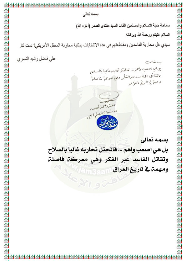 محاربة الفاسد أهم وأصعب من محاربة المحتل لأن المعركة مع الفاسد تكون من خلال الفكر استفتاء الزعيم العراقي السيد مقتدى محمد الصدر اعزه الله 9 / 5 / 2018