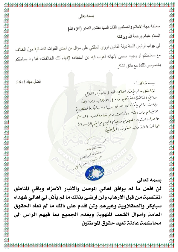 رداً على ما صرّح به نوري المالكي على احد القنوات الفضائية من استعداده لانهاء الخلافات مع سماحته استفتاء الزعيم العراقي السيد مقتدى محمد الصدر اعزه الله 10 / 5 / 2018