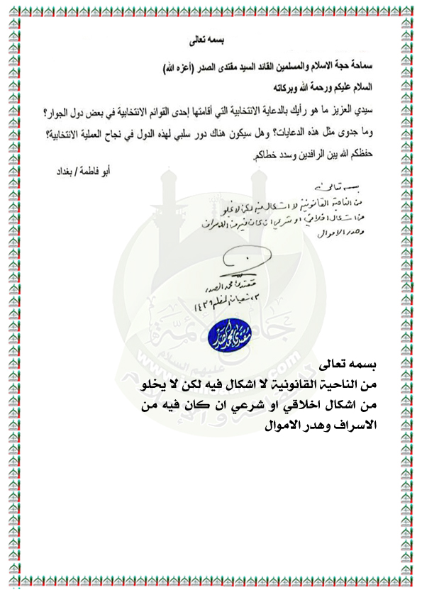 دعايات انتخابية لإحدى القوائم في بعض دول الجوار استفتاء الزعيم العراقي السيد مقتدى محمد الصدر اعزه الله 10 / 5 / 2018