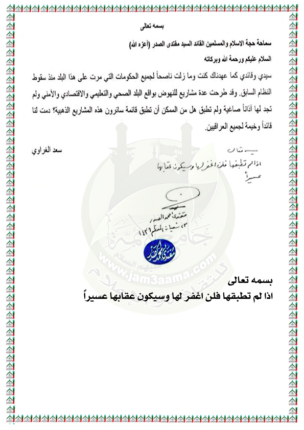سوف لن يُغفر لتحالف سائرون في حال عدم تطبيق المشاريع والبرامج التي تخدم الشعب العراقي وان العقاب سيكون عسيراً استفتاء الزعيم العراقي السيد مقتدى محمد الصدر اعزه الله 10 / 5 / 2018