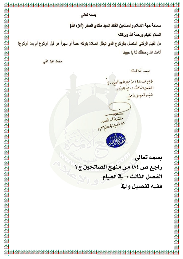 ترك القيام المتصل بالركوع في الصلاة استفتاء الزعيم العراقي السيد مقتدى محمد الصدر اعزه الله 15 / 5 / 2018