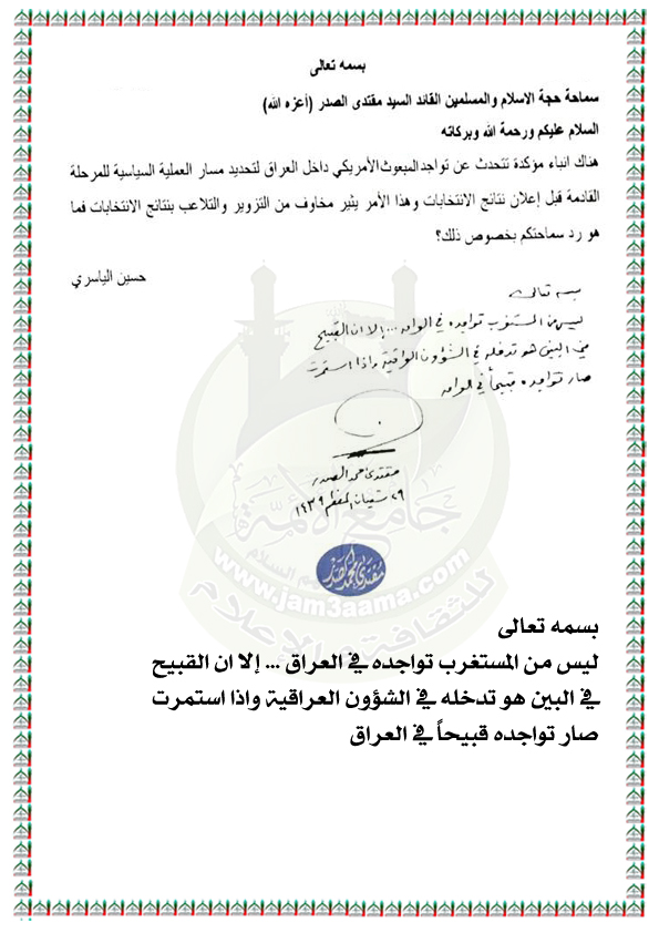 تواجد المبعوث الامريكي في العراق مما يثير المخاوف من التلاعب وتزوير نتائج الانتخابات البرلمانية استفتاء الزعيم العراقي السيد مقتدى محمد الصدر اعزه الله 16 / 5 / 2018
