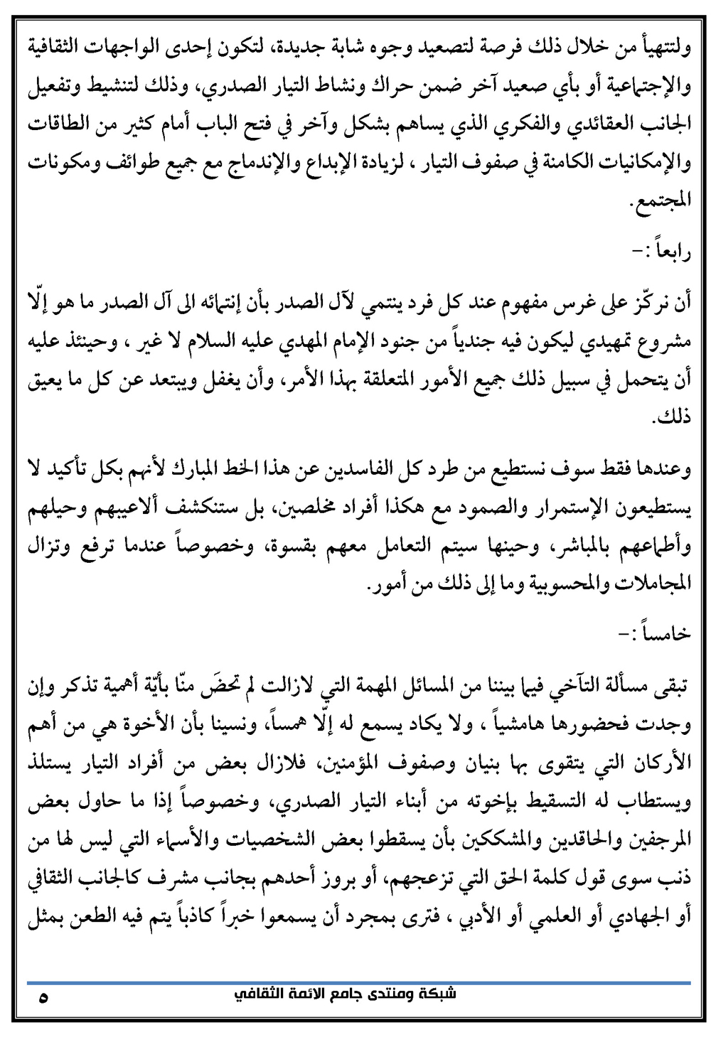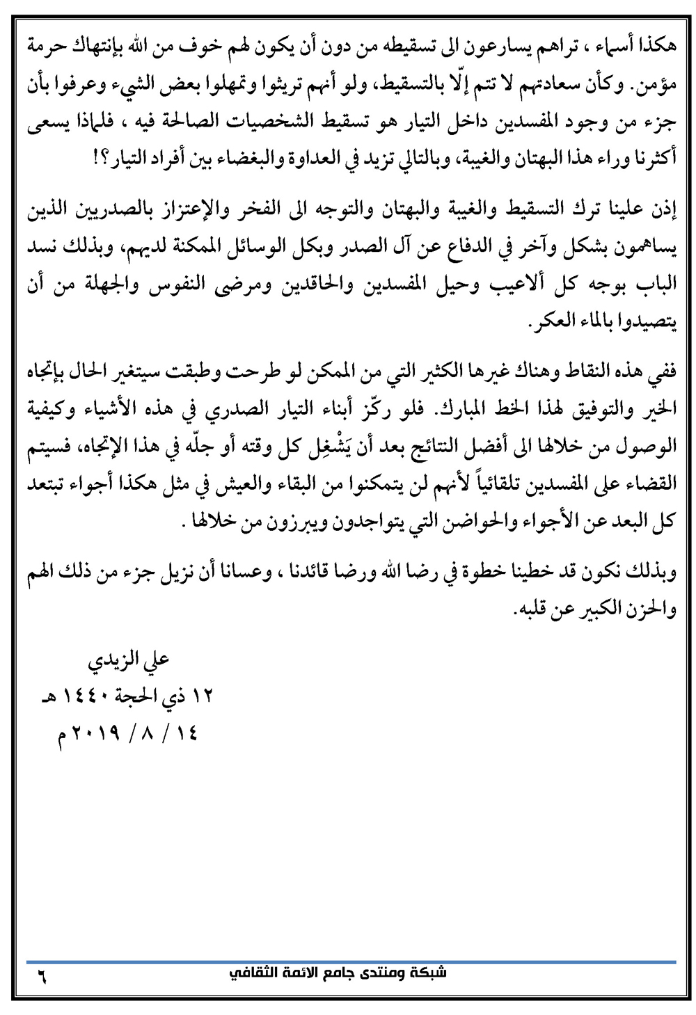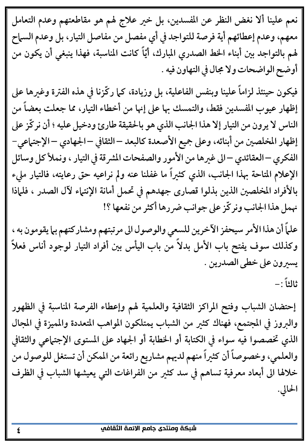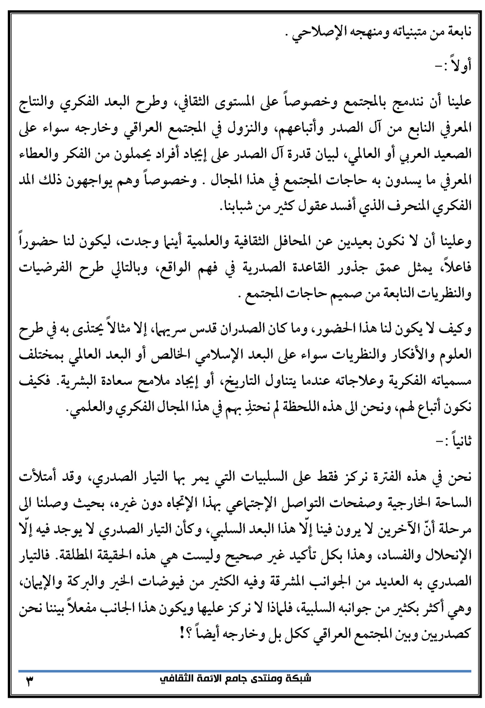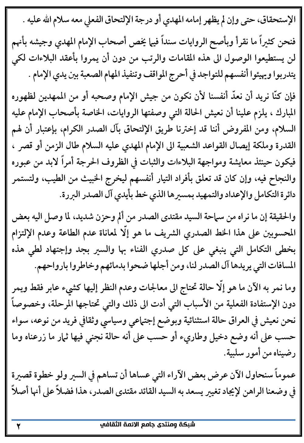 هي ليست بظروف قلقة ، ولا هي حالة طارئة يمرّ بها التيار الصدري أو قل القاعدة الصدرية التي سارت على خطى آل الصدر لأكثر من عشرين عاماً، فهي منذ ذلك الوقت بدأت بالنمو والحِراك ومواجهة الصعاب التي أُحيطت بالتدرج والتعاقب في الشدة والبلاء، وهذا الأمر ليس بغريب، لمن يريد الأمور العوالي والوصول الى القمم الغوالي، فهي لن تنال إلّا بالتمحيص والإختبار الذي تبلغ به القلوب الحناجر، وأن نظن بآل الصدر الظنون. فلو تساءلنا عن الأفراد الذين يريدون أن يعدّوا أنفسهم ليكونوا، أفراداً يناصروا إمامهم المهدي في ظهوره المبارك، وبالتالي ليكونوا من جنده وهو يمارس دوره في فتح العالم ونشر العدل العالمي فيه، هل يُتركون دون تمحيص وبلاء وبالتالي يعيشون دوراً بسيطاً وهامشياً مع مفردات الغيبة، ومن ثم تبقى لهم فسحة طويلة في هذه الدنيا، ليبقوا يراوحون في طريق الأمن والراحة ، دون أي إزعاج يُذكر، أو خطر به ينذر . أم يحيط بهم البلاء كدائرة من الإختبار المحكم من جميع جهاته، ليكون بالتالي هو مفتاح النجاح للفرد المؤمن سواء بالإختيار أو بالإضطرار، فكل بحسب درجة إيمانه وإخلاصه، ومن ثم تصديقه التام بالطريق الذي إختاره للوصول الى مقصوده ، ليعيش درجة الإستحقاق، حتى وإن لم يظهر إمامه المهدي أو درجة الإلتحاق الفعلي معه سلام الله عليه . فنحن كثيراً ما نقرأ وبأصح الروايات سنداً فيما يخص أصحاب الإمام المهدي وجيشه بأنهم لن يستطيعوا الوصول الى هذه المقامات والرتب من دون أن يمروا بأعقد البلاءات لكي يتدربوا ويهيئوا أنفسهم للتواجد في أحرج المواقف وتنفيذ المهام الصعبة بين يدي الإمام . فإن كنّا نريد أن نعدّ أنفسنا لأن نكون من جيش الإمام وصحبه أو من الممهدين لظهوره المبارك ، يلزم علينا أن نعيش الحالة التي وصفتها الروايات، الخاصة بأصحاب الإمام عليه السلام، ومن المفروض أننا قد إخترنا طريق الإلتحاق بآل الصدر الكرام، بإعتبار أن لهم القدرة وملكة إيصال القواعد الشعبية الى الإمام المهدي عليه السلام طال الزمن أو قصر ، فيكون حينئذ معايشة ومواجهة البلاءات والثبات في الظروف الحرجة أمراً لابد من عبوره والنجاح فيه، وإن كان قد تعلق بأفراد التيار أنفسهم ليخرج الخبيث من الطيب، ولتستمر دائرة التكامل والإعداد والتمهيد بمسيرها الذي خط بأيدي آل الصدر البررة. والحقيقة إن ما نراه من سماحة السيد مقتدى الصدر من ألم وحزن شديد، لما وصل اليه بعض المحسوبين على هذا الخط الصدري الشريف ما هو إلّا لمعاناة عدم الطاعة وعدم الإلتزام بخطى التكامل التي ينبغي على كل صدري الفناء بها والسير بجد وإجتهاد لطي هذه المسافات التي يريدها آل الصدر لنا، ومن أجلها ضحوا بدمائهم وخاطروا بارواحهم. وما نمر به الآن ما هو إلّا حالة تحتاج الى معالجات وعدم النظر إليها كشيء عابر فقط ويمر دون الإستفادة الفعلية من الأسباب التي أدت الى ذلك والتي تحتاجها المرحلة، وخصوصاً نحن نعيش في العراق حالة استثنائية وبوضع إجتماعي وسياسي وثقافي فريد من نوعه، سواء حسب على أنه وضع دخيل وطاريء أو حسب على أنه حالة نجني فيها ثمار ما زرعناه وما رضيناه من أمور سلبية. عموماً سنحاول الآن عرض بعض الآراء التي عساها أن تساهم في السير ولو خطوة قصيرة في وضعنا الراهن لإيجاد تغيير يسعد به السيد القائد مقتدى الصدر، هذا فضلاً على أنها أصلاً نابعة من متبنياته ومنهجه الإصلاحي . أولاً :- علينا أن نندمج بالمجتمع وخصوصاً على المستوى الثقافي، وطرح البعد الفكري والنتاج المعرفي النابع من آل الصدر وأتباعهم، والنزول في المجتمع العراقي وخارجه سواء على الصعيد العربي أو العالمي، لبيان قدرة آل الصدر على إيجاد أفراد يحملون من الفكر والعطاء المعرفي ما يسدون به حاجات المجتمع في هذا المجال . وخصوصاً وهم يواجهون ذلك المد الفكري المنحرف الذي أفسد عقول كثير من شبابنا. وعلينا أن لا نكون بعيدين عن المحافل الثقافية والعلمية أينما وجدت، ليكون لنا حضوراً فاعلاً، يمثل عمق جذور القاعدة الصدرية في فهم الواقع، وبالتال