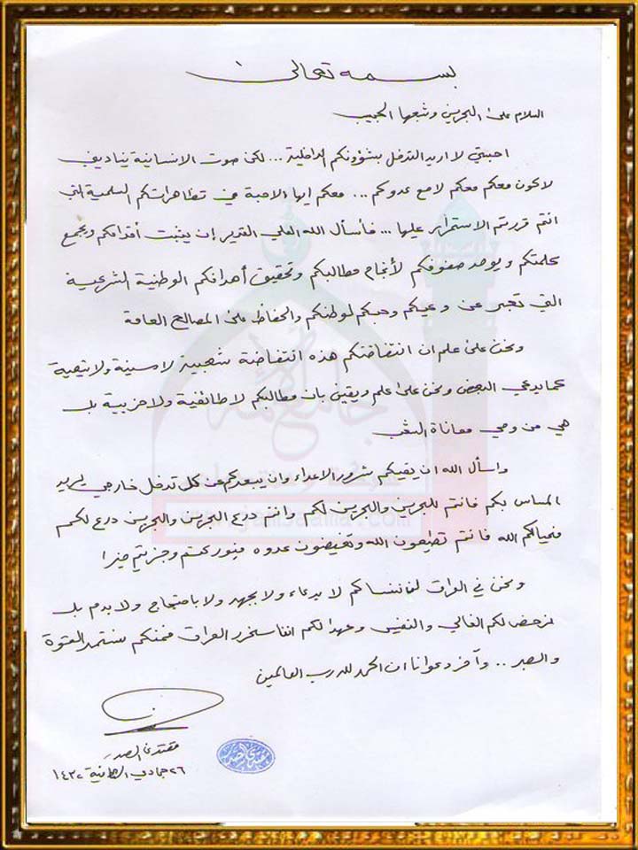 السيد القائد مقتدى الصدر (اعزه الله)يوجه بيانا الى شعب البحرين بتاريخ 30-5-2011