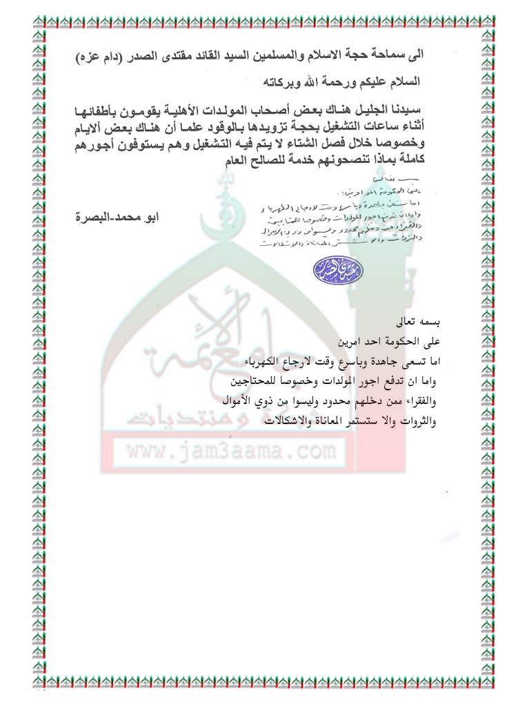 المولدات الاهلية استفتاء سماحة السيد القائد مقتدى الصدر ( اعزه الله ) 23 - 11 - 2010